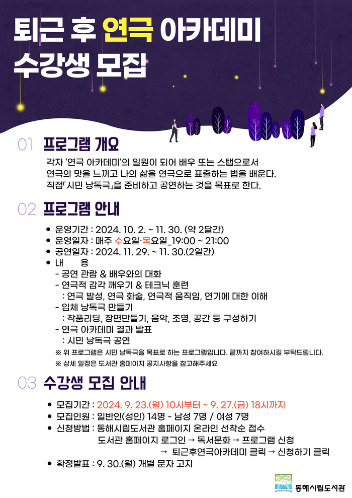 이번 프로그램은 동해시민이며 성인이면 누구나 참여할 수 있고, 시민 낭독극 공연 시 구성 역할을 고려하여 남성 7명, 여성 7명을 모집한다. 참가 신청은 9월 23일 오전 10시부터 9월 27일 오후 6시까지 동해시립도서관 홈페이지를 통해 신청하면 된다.