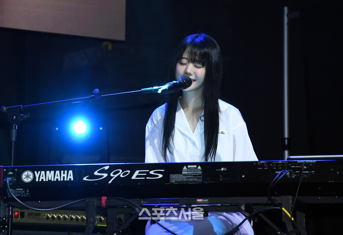 걸밴드 QWER(큐더블유이알) 히나가 23일 서울 서대문구 예스24 월더로크홀에서 열린 미니 2집 ‘알고리즘스 블러썸(Algorithm’s Blossom)‘을 발매 기념 쇼케이스에서 타이틀곡 ’내 이름은 맑음‘ 무대를 선보이고 있다.