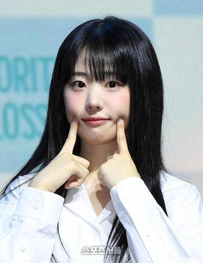 걸밴드 QWER(큐더블유이알) 히나가 23일 서울 서대문구 예스24 월더로크홀에서 열린 미니 2집 ‘알고리즘스 블러썸(Algorithm’s Blossom)‘을 발매 기념 쇼케이스에서 취재진을 향해 포즈를 취하고 있다.
