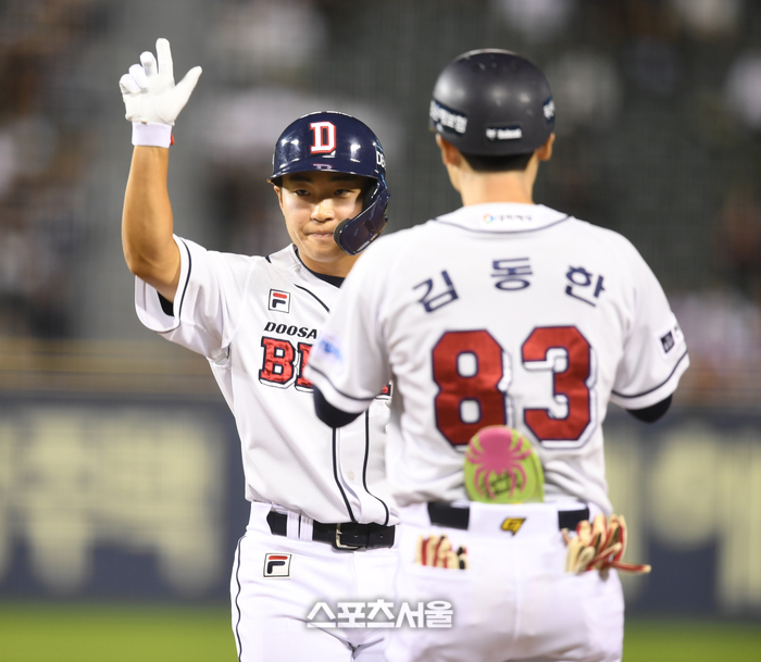두산 여동건이 23일 잠실야구장에서 열린 2024 KBO리그 SSG와 경기 2회말 1사1루 안타를 친 후 세리머니를 하고 있다.