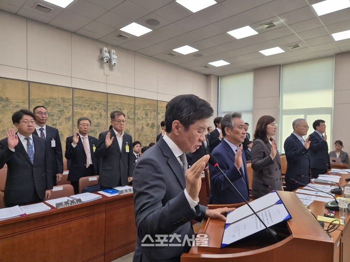 [스포츠서울 | 글·사진 이상배 전문기자] 24일 오전 국회 문화체육관광위원회(위원장 전재수)에 증인으로 출석한 정몽규 대한축구협회 회장이 증인 및 참고인들과 함께 증언대에 섰다.