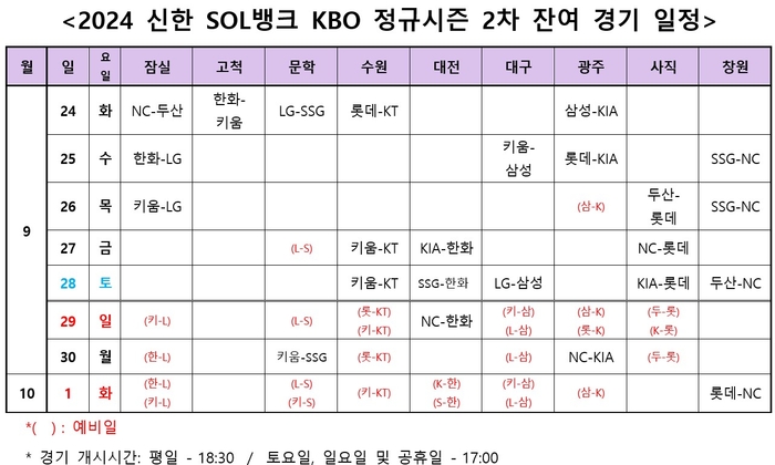 경기시간은 평일 오후 6시30분, 토요일 오후 5시다. 2차 잔여일정으로 치르는 29일과 10월1일은 이동시간 등을 고려해 오후 5시에 플레이볼 한다.