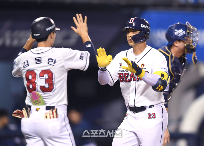 두산 강승호가 24일 잠실야구장에서 열린 2024 KBO리그 NC와 경기 2회말 2사 우월홈런을 날린 후 김동한 코치와 하이파이브를 하고 있다.