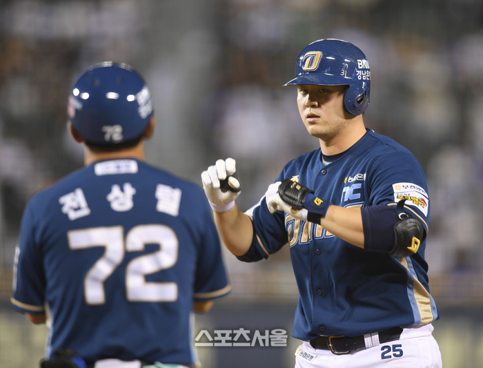 NC 김형준이 24일 잠실야구장에서 열린 2024 KBO리그 두산과 경기 6회초 2사2루 1타점 좌전안타를 친 후 전상렬 코치와 하이파이브를 하고 있다.