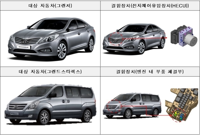 현대차 그랜저 등 5개 차종 62만349대는 전자제어유압장치(HECU) 내구성 부족으로 화재 가능성이 발견됐다. 리콜은 27일부터다.