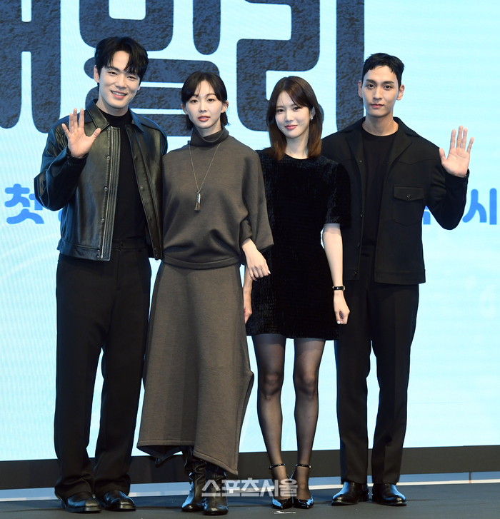 배우 김정현(왼쪽부터), 금새록, 양혜지, 최태준이 25일 서울 구로구 더 세인트에서 진행된 KBS2 특별기회 주말드라마 ‘다리미 패밀리’ 제작발표회에서 취재진을 향해 포즈를 취하고 있다.