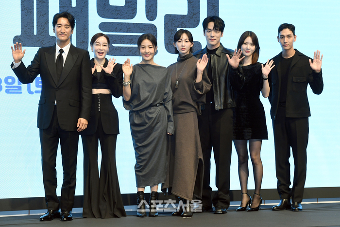 25일 서울 구로구 더 세인트에서 진행된 KBS2 특별기회 주말드라마 ‘다리미 패밀리’ 제작발표회에서 출연 배우들이 취재진을 향해 포즈를 취하고 있다. 왼쪽부터 신현준, 김혜은, 박지영, 금새록, 김정현, 양혜지, 최태준.