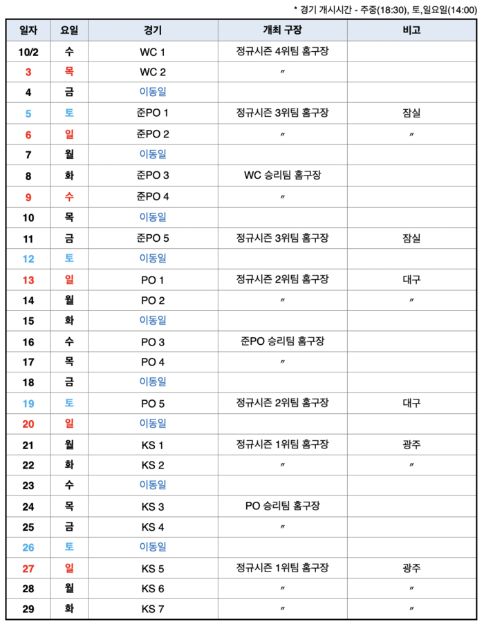 준플레이오프와 플레이오프는 5전 3선승제, 한국시리즈는 7전 4선승제로 열리며, 각 시리즈 사이 최소 1일은 이동일로 편성한다. 포스트시즌 경기가 우천 등으로 열리지 못할 경우 다음 날로 순연되며, 경기가 미뤄져도 정해진 경기 일정에 영향을 미치지 않을 경우에는 예정대로 진행한다.