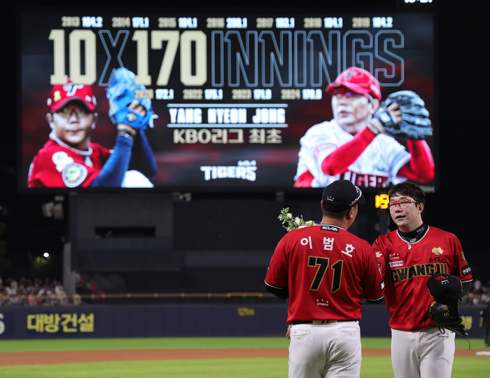 또 있다. 올시즌 171.1이닝이다. 10시즌 연속 170이닝 달성이다. 역대 최초 기록이다. 지난 2014년 171.1이닝을 기록한 후 메이저리그(ML)에 진출한 2021년을 제외하면 매 시즌 170이닝 이상 먹었다. 하루에 두 개 대기록. 이범호 감독이 꽃다발 전달하기 바빴다.