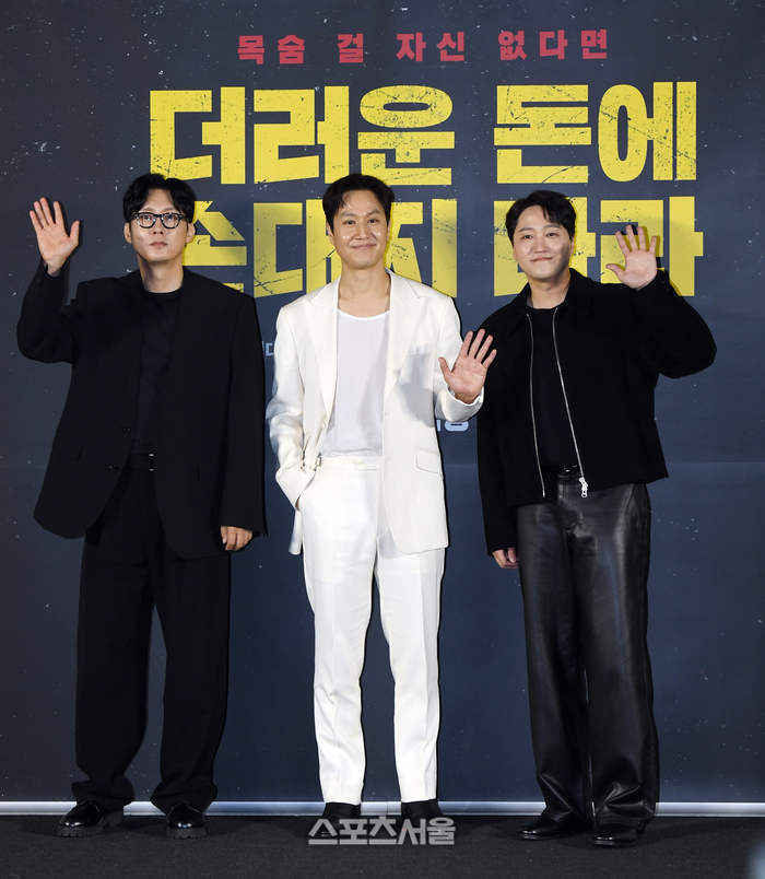 배우 박병은(왼쪽부터), 정우, 김대명이 26일 서울 용산구 아이파크몰 CGV에서 진행된 영화 ‘더러운 돈에 손대지 마라’ 제작보고회에서 취재진을 향해 포즈를 취하고 있다.