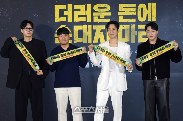 배우 박병은(왼쪽부터), 김민수 감독, 배우 정우, 김대명이 26일 서울 용산구 아이파크몰 CGV에서 진행된 영화 ‘더러운 돈에 손대지 마라’ 제작보고회에서 취재진을 향해 포즈를 취하고 있다.
