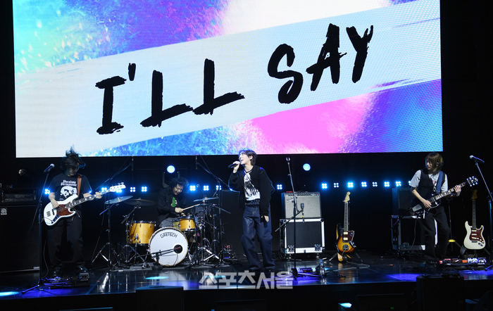 드래곤포니(Dragon Pony)가 26일 서울 서대문구 예스24 원더로크홀에서 열린 첫 EP 앨범 ‘팝업(POP UP)’ 발매 기념 쇼케이스에서 열정적인 공연을 선보이고 있다.