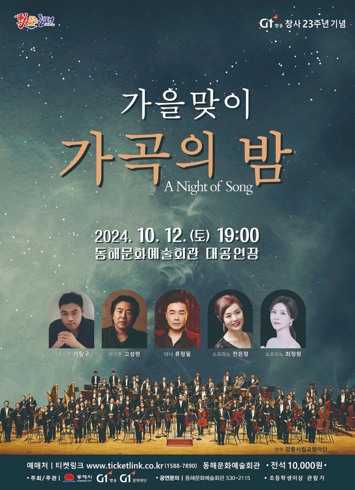 ‘가을맞이 가곡의 밤’ 기획초청 공연이 10월 12일 오후 7시 동해문화예술회관 대공연장에서 열린다. 이번 공연은 강릉시립교향악단의 교향악 연주와 동해시립합창단의 협연, 대한민국을 대표하는 성악가로 바리톤 고성현, 테너 류정필, 소프라노 최정원, 전은정이 출연하는 고품격 음악회이다.