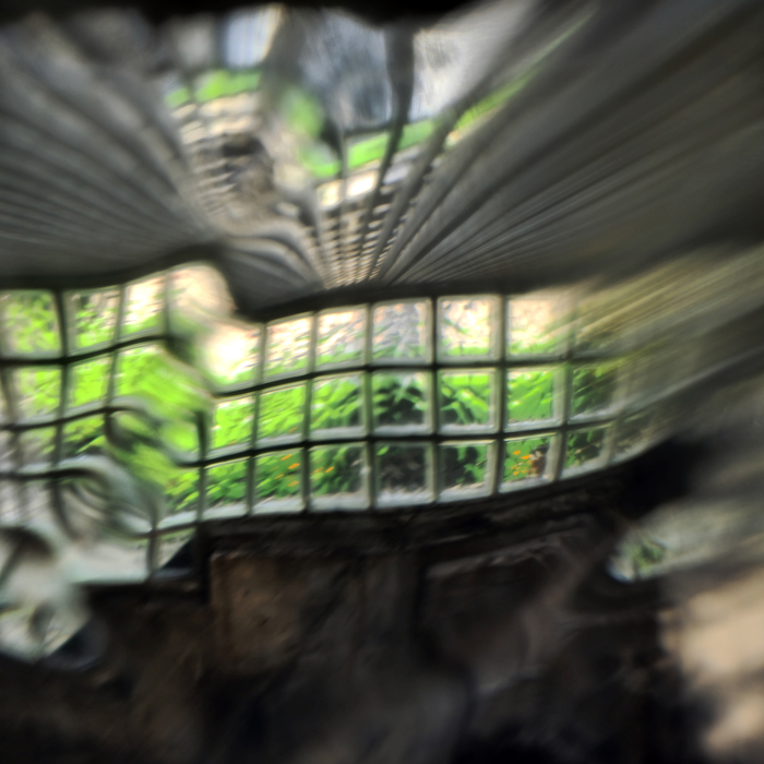 초록색이 창 너머 눈에 선명하지만, 내부의 공간은 일그러져 있어 심란한 인상을 준다.