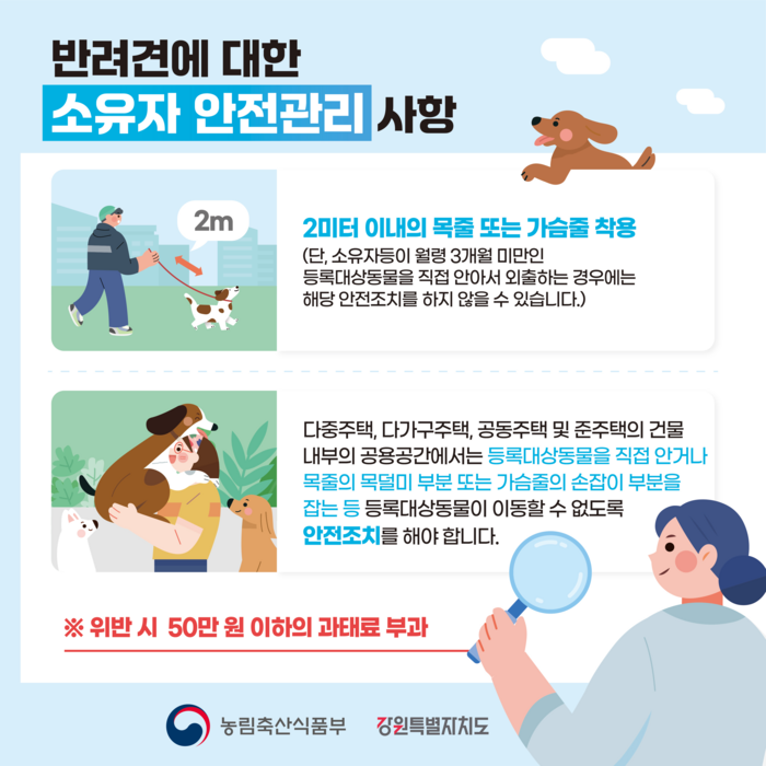[스포츠서울ㅣ춘천=김기원기자]강원특별자치도는 반려동물 동반 행사 등 각종 야외활동이 빈번한 가을철을 맞아 2024년 하반기 반려견 소유자 준수사항 홍보 및 현장단속을 10월 1일부터 10월 31일까지 도 내 18개 시군에서 실시한다고 밝혔다.