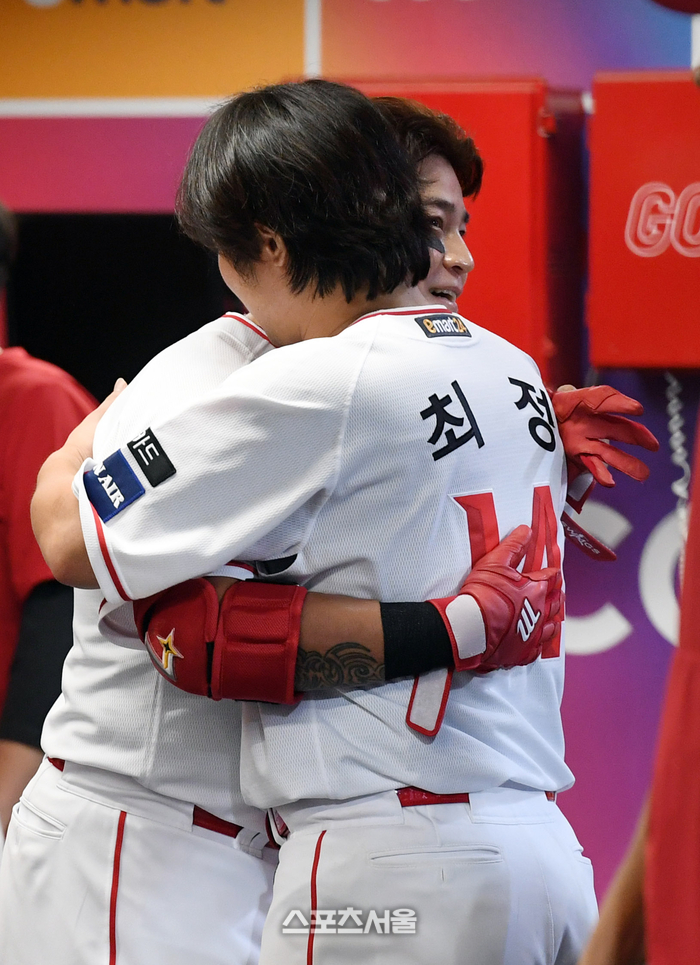 은퇴를 선언한 SSG 추신수가 30일 인천 SSG 랜더스필드에서 열린 2024 KBO리그 키움과 경기 8회말 1사 대타로 타석에 들어서 2루 땅볼로 아웃된 뒤 더그아웃에서 최정과 포옹을 하고 있다. 2024. 9. 30.