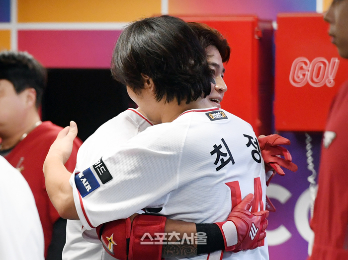 은퇴를 선언한 SSG 추신수가 30일 인천 SSG 랜더스필드에서 열린 2024 KBO리그 키움과 경기 8회말 1사 대타로 타석에 들어서 2루 땅볼로 아웃된 뒤 더그아웃에서 최정과 포옹을 하고 있다. 2024. 9. 30.