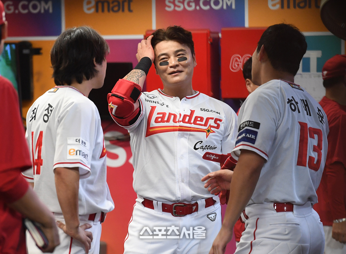 은퇴를 선언한 SSG 추신수(가운데)가 30일 인천 SSG 랜더스필드에서 열린 2024 KBO리그 키움과 경기 8회말 1사 대타로 타석에 들어서 2루 땅볼로 아웃된 뒤 더그아웃에서 최정, 하재훈과 이야기를 나누고 있다. 2024. 9. 30.