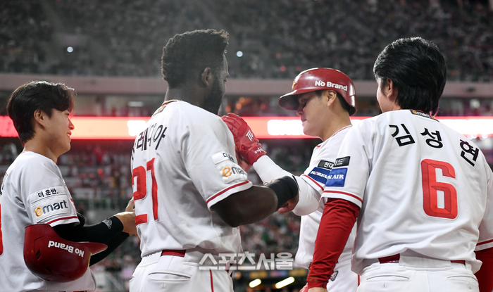 은퇴를 선언한 SSG 추신수(오른쪽 둘째)가 30일 인천 SSG 랜더스필드에서 열린 2024 KBO리그 키움과 경기 8회말 1사 대타로 타석에 들어서 2루 땅볼로 아웃된 뒤 동료들과 하이파이브를 하고 있다. 2024. 9. 30.