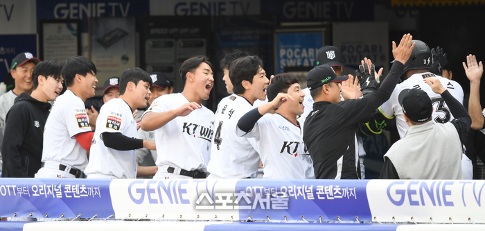 KT 로하스가 1일 수원 KT위즈파크에서 열린 2024 KBO리그 SSG와 5위 결정전 1회말 1사1루 좌중월 홈런을 날린 후 동료들과 하이파이브를 하고 있다.