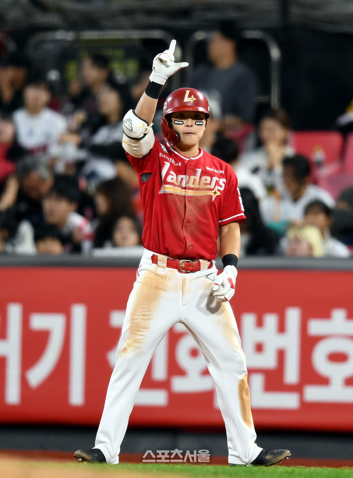 SSG 정준재가 1일 수원 KT위즈파크에서 열린 2024 KBO리그 KT와 5위 결정전 5회초 2사1루 중전안타를 친 후 세리머니를 하고 있다.