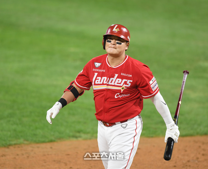 SSG 추신수가 1일 수원 KT위즈파크에서 열린 2024 KBO리그 KT와 5위 결정전 9회말 1사1루 헛스윙 삼진아웃으로 물러나고 있다.