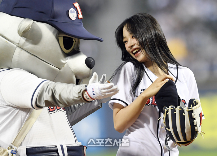 뉴진스 민지가 2일 잠실구장에서 열린 2024 KBO리그 두산과 KT의 와일드카드 결정 1차전에서 시구를 한 뒤 두산 베어스의 마스코트 철웅이를 바라보며 미소를 짓고 있다. 2024. 10. 2.