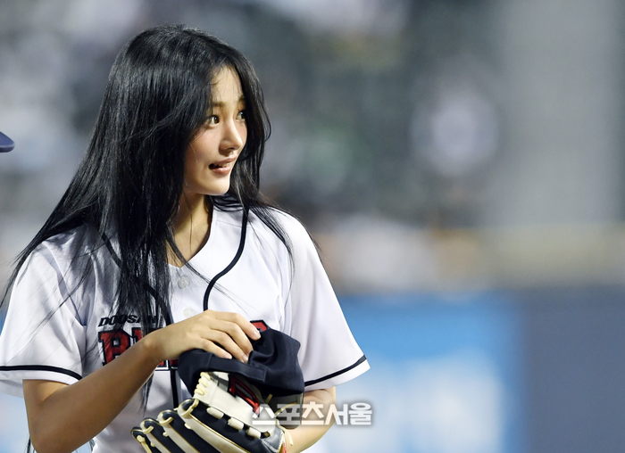 뉴진스 민지가 2일 잠실구장에서 열린 2024 KBO리그 두산과 KT의 와일드카드 결정 1차전에서 시구를 한 뒤 그라운드를 빠져나가고 있다. 2024. 10. 2.