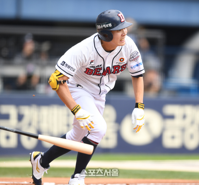 두산 정수빈이 3일 잠실야구장에서 열린 2024 KBO 포스트시즌 와일드카드 결정 2차전 KT와 경기 1회말 투수앞 땅볼을 치고 있다.