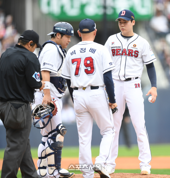 두산 선발투수 최승용이 3일 잠실야구장에서 열린 2024 KBO 포스트시즌 와일드카드 결정 2차전 KT와 경기 5회초 2사1,2루 상황에서 교체되어 마운드를 내려오고 있다.