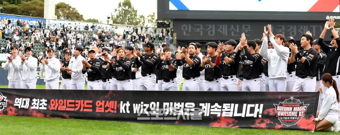 KT 선수들이 3일 잠실야구장에서 열린 2024 KBO 포스트시즌 와일드카드 결정 2차전 두산과 경기 후 팬들에 인사를 하고 있다.