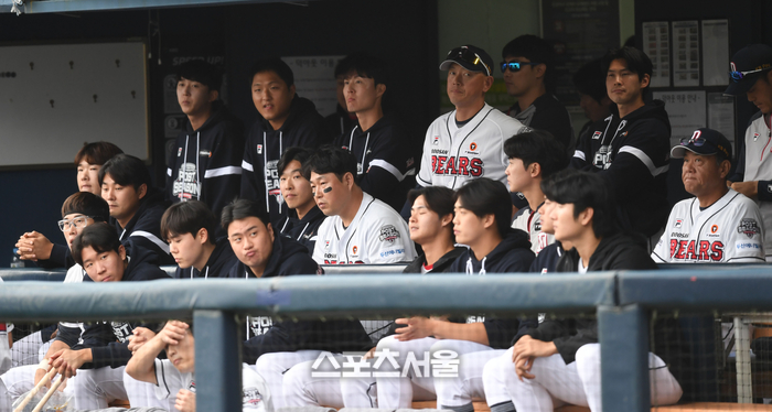 두산 선수들이 3일 잠실야구장에서 열린 2024 KBO 포스트시즌 와일드카드 결정 2차전 KT와 경기 9회 마지막 공격을 지켜보고 있다.