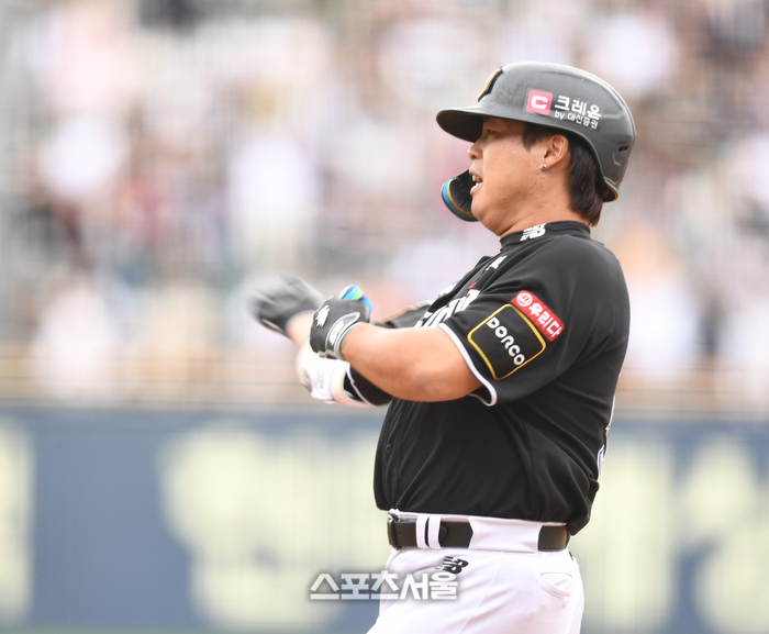 전진수비 하고 있던 3루수 허경민-유격수 김재호 사이로 유유히 빠져나갔다. 귀하디귀한 적시타다. 1-0이 됐다. 강백호는 1루로 달리며 크게 포효했다.