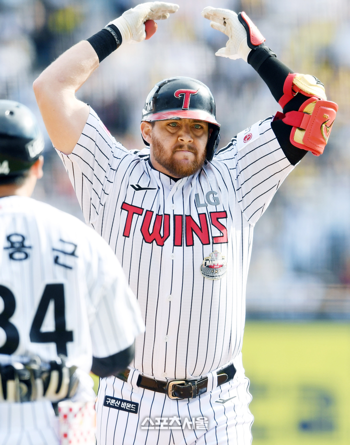 LG 오스틴이 5일 잠실구장에서 열린 2024 KBO리그 KT와의 준플레이오프 1차전 4회말 1사 2루 상황에서 KT 선발 고영표를 상대로 적시타를 친 뒤 세리머니를 하고 있다. 2024. 10. 5.