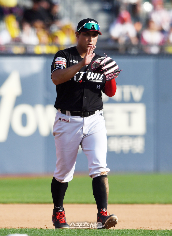 KT 황재균이 5일 잠실구장에서 열린 2024 KBO리그 LG와의 준플레이오프 1차전 8회말 무사 LG 홍창기의 타구를 처리한 뒤 박수를 치고 있다. 2024. 10. 5.