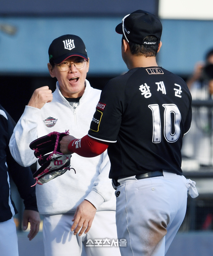 KT 이강철 감독(왼쪽)이 5일 잠실구장에서 열린 2024 KBO리그 LG와의 준플레이오프 1차전에서 LG에 3-2로 승리한 뒤 황재균과 하이파이브를 나누며 기뻐하고 있다. 2024. 10. 5.
