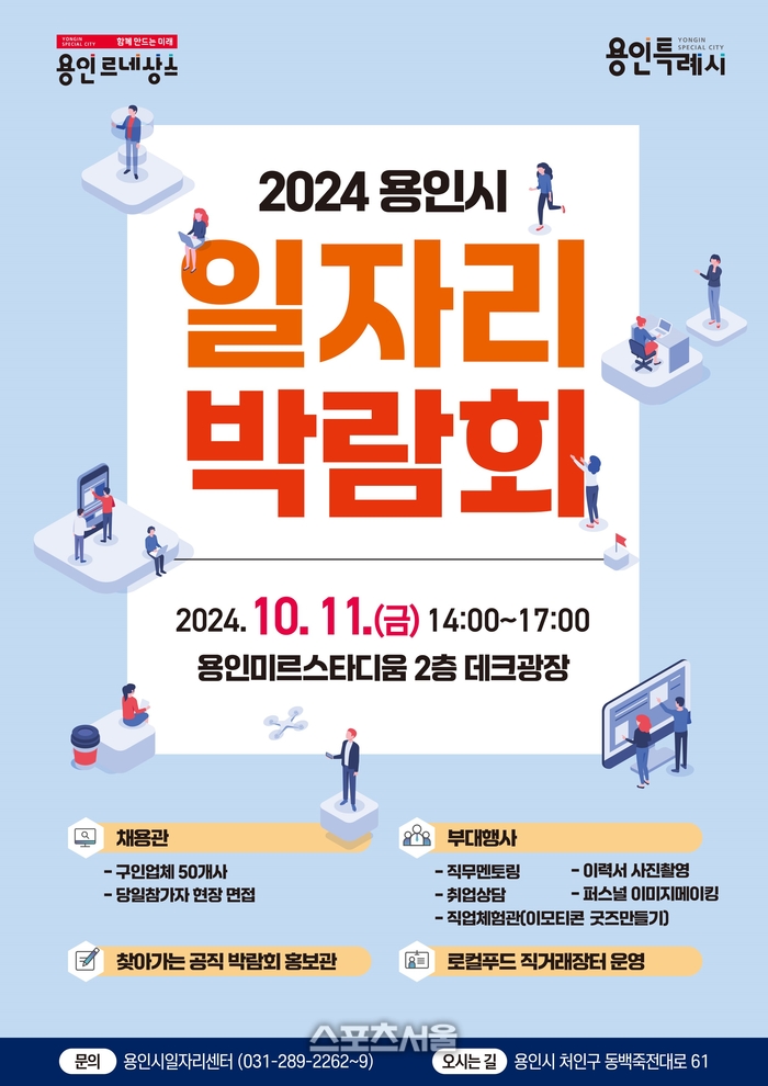 〔스포츠서울│용인=좌승훈기자〕경기 용인시는 오는 11일 처인구 삼가동 용인미르스타디움 2층 데크 광장에서 ‘2024년 하반기 일자리박람회’를 진행한다.