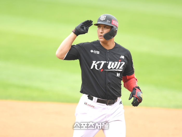 KT 황재균이 6일 잠실야구장에서 열린 LG와 2024 KBO 준플레이오프 2차전 2회초 2사3루 1타점 좌전안타를 친 후 세리머니를 하고 있다.
