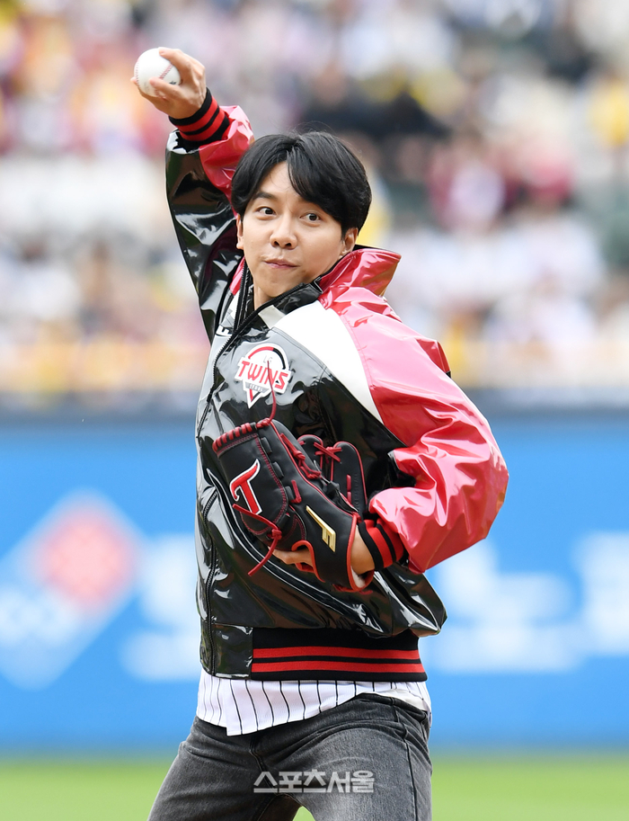 가수 경 배우 이승기가 6일 잠실구장에서 열린 2024 KBO리그 LG와 KT의 준플레이오프 2차전에 앞서 시구를 하고 있다. 2024. 10. 6.