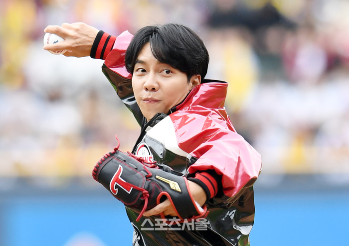 가수 경 배우 이승기가 6일 잠실구장에서 열린 2024 KBO리그 LG와 KT의 준플레이오프 2차전에 앞서 시구를 하고 있다. 2024. 10. 6.