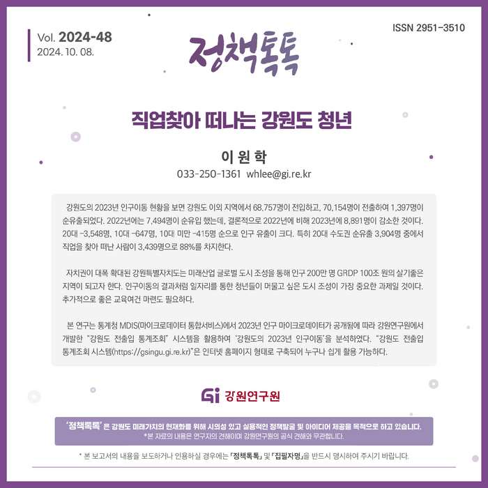 [스포츠서울ㅣ춘천=김기원기자]강원연구원(원장 현진권)은 “직업찾아 떠나는 강원도 청년”이라는 제목으로 2024년 제48호 정책톡톡을 발간했다.