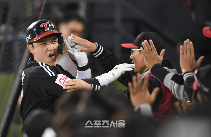 LG 박동원이 8일 수원 KT위즈파크에서 열린 KT와 2024 KBO 준플레이오프 3차전 2회초 1사 좌월홈런을 날린 후 염경엽 감독과 하이파이브를 하고 있다.