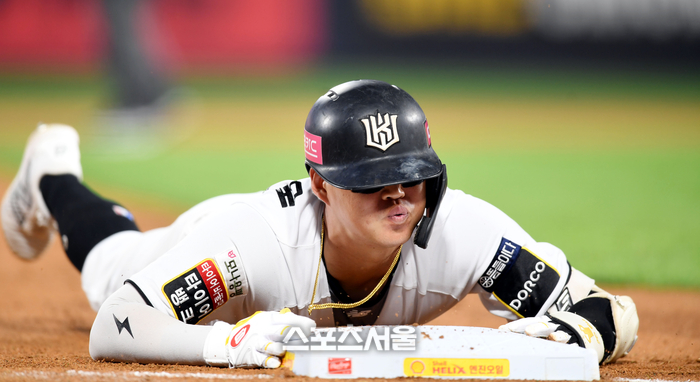 KT 배정대가 8일 수원 KT위즈파크에서 열린 LG와 2024 KBO 준플레이오프 3차전 2회말 1사1루 중전안타를 친 후 상대 실책을 틈 타 3루까지 진루하고 있다.