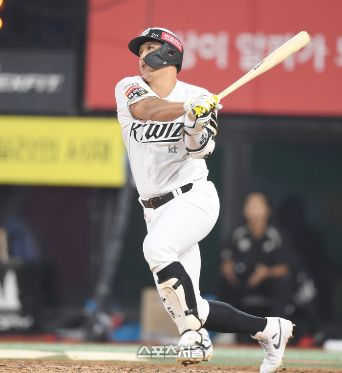 KT 황재균이 8일 수원 KT위즈파크에서 열린 LG와 2024 KBO 준플레이오프 3차전 3회말 2사1루 좌전안타를 치고 있다.
