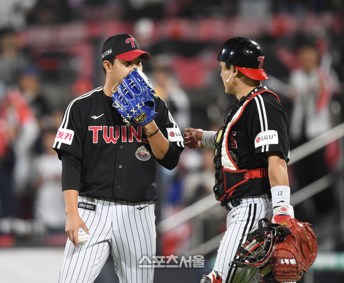 LG 투수 유영찬이 8일 수원 KT위즈파크에서 열린 KT와 2024 KBO 준플레이오프 3차전 9회말 무사1루 김상수 타석 때 보크를 한 후 박동원과 이야기를 나누고 있다.