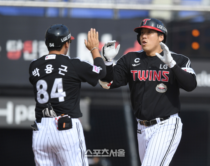 LG 김현수가 9일 수원 KT위즈파크에서 열린 KT와 2024 KBO 준플레이오프 4차전 2회초 2사 우중월 홈런을 날린 후 박용근 코치와 하이파이브를 하고 있다.