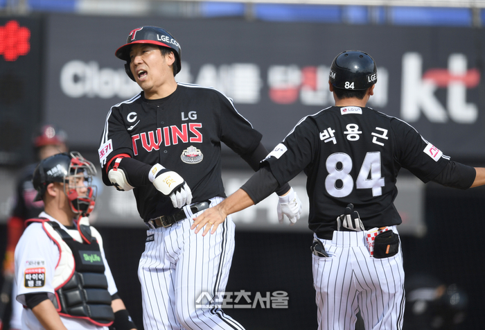 LG 김현수가 9일 수원 KT위즈파크에서 열린 KT와 2024 KBO 준플레이오프 4차전 2회초 2사 우중월 홈런을 날린 후 박용근 코치와 하이파이브를 하고 있다.