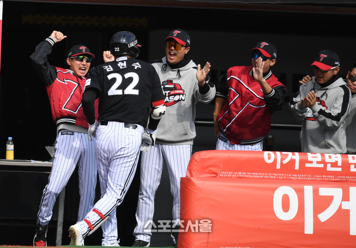 LG 김현수가 9일 수원 KT위즈파크에서 열린 KT와 2024 KBO 준플레이오프 4차전 2회초 2사 우중월 홈런을 날린 후 염경엽 감독과 하이파이브를 하고 있다.