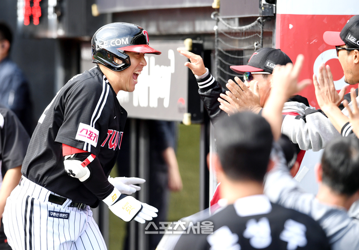 LG 김현수(왼쪽)가 9일 수원 KT위즈파크에서 열린 2024 KBO리그 KT와의 준플레이오프 4차전 2회초 2사 KT 선발 쿠에바스를 상대로 선제 솔로 홈런을 친 뒤 염경엽 감독과 하이파이브를 하고 있다. 2024. 10. 9.