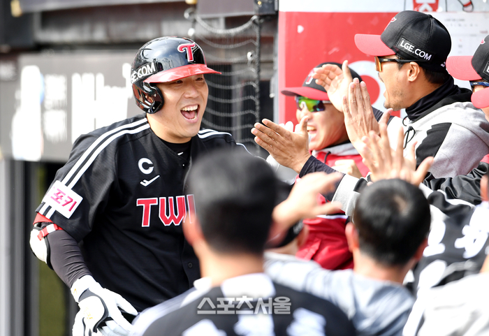 LG 김현수(왼쪽)가 9일 수원 KT위즈파크에서 열린 2024 KBO리그 KT와의 준플레이오프 4차전 2회초 2사 KT 선발 쿠에바스를 상대로 선제 솔로 홈런을 친 뒤 코칭스태프와 하이파이브를 하고 있다. 2024. 10. 9.